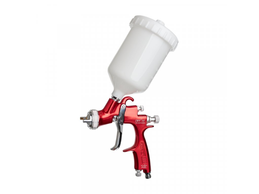 Vzduchová konvenčná striekacia pištoľ STAR SMV4000 s horným prívodom náterovej hmoty, zo spádovej nádobky dosahuje vynikajúce výsledky, vysoké nanášacie rýchlosti a prenosovú účinnosť 65% pri 2 baroch. Pištoľ disponuje vysoko efektívnou vzduchovou hubicou s jedinečným vejárovitým tvarom lúča navrhnutým pre optimálnu účinnosť pokrytia a minimálny prestrek. Tryska a ihla sú vyrobené z nerezového materiálu.